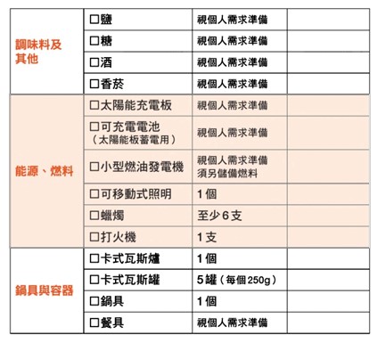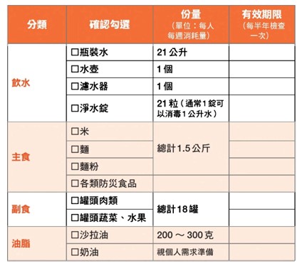 - 主食:一個2~4人小家庭,一周要3.78公斤的主食,可準備災米麵食、罐頭、即時品、泡麵
