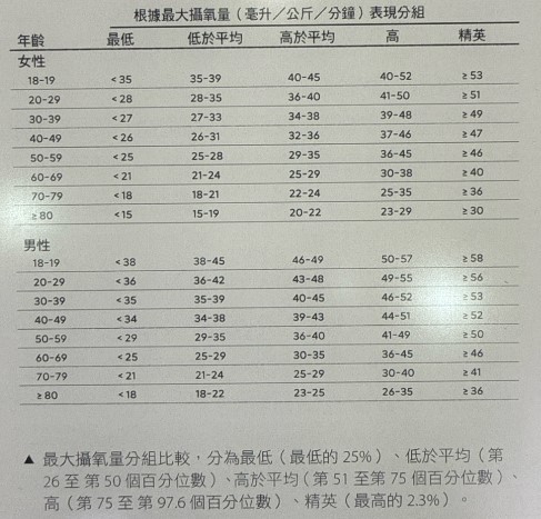 最大攝氧量每十年會降低 10%,過了 50 歲每十年降低 15%。所以【現在】的最大攝氧量如果只有平均水準,是不夠讓你長壽的。